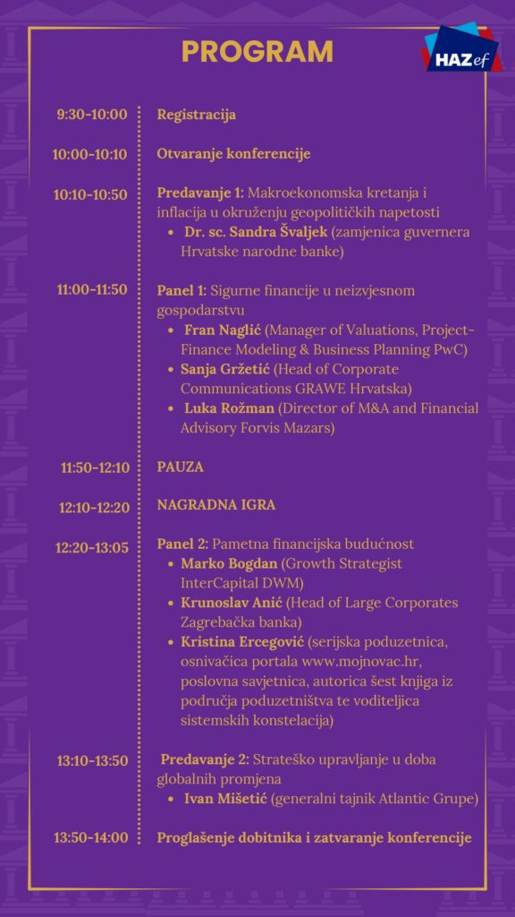 Putem predavanja, panela i razgovora sa stručnjacima iz vodećih institucija i kompanija, sudionici će steći praktična znanja iz područja osobnih i javnih financija, ulaganja te strateškog upravljanja u doba globalnih promjena.